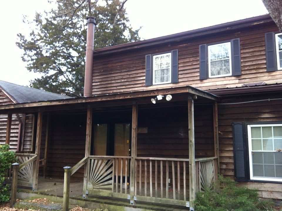 Hidden from street in unique setting, on a secluded half-acre lot. High ceilings, 700 sft master suite. Very large 2nd Bedroom downstairs adjacent to full bath. Tin-roofed porch with swing, plenty of fenced yard for dogs. After 1st year, lease renews month to month.