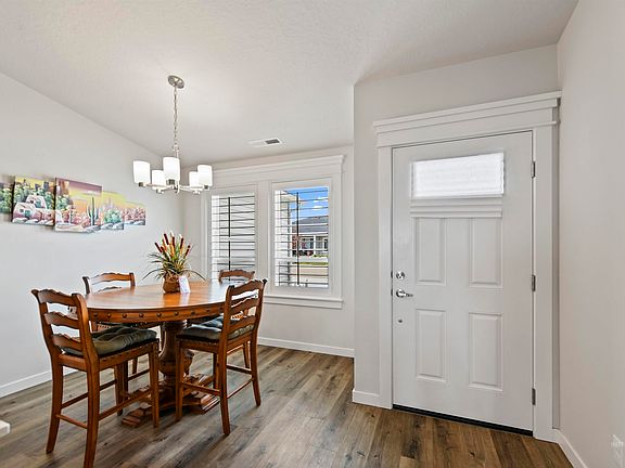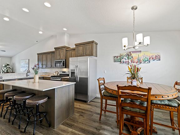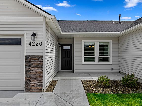 Better than new, this single level townhome is wonderfully designed giving you a spacious and open great room concept w/vaulted ceilings. The beautiful kitchen comes complete with custom cabinets, quartz breakfast bar and center island that provides plenty of workspace. Stainless steel appliances w/upgraded gas range, refrigerator & full tile backsplash not to mention the butler’s pantry. The dining room's lg picture windows brings in an abundance of natural light making this home bright & airy. The Master bath features quartz countertops, dual sinks and dark stained cabinets. Separate shower and water closet. 2 addtional bedrooms and main bathroom. Custom shutters grace all the windows! Enjoy the covered patio & east facing backyard with mountain views. Plenty of room for gardening & pets. The garage features expoy floors and painted walls. Does NOT share common walls. Air space wall built between units for max. sound barrier.