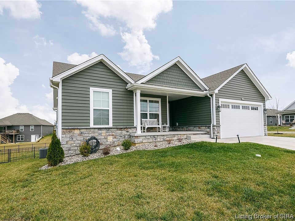 PRICED BELOW APPRAISAL! Current owner paid $394,724 at the end of 2022 and then put $15,000 (=/-) of upgrades into it! They would have stayed forever but were awarded a job opportunity in another state and must go, so THEIR LOSS on this house IS YOUR GAIN! This beautiful ranch features 4 bedrooms, 3 full baths & a beautifully finished WALK-OUT lower level! The first floor includes a light & bright living room, laundry & a WELL APPOINTED KITCHEN that includes a GE STAINLESS DISHWASHER, SMOOTH TOP STOVE, MICROWAVE GRANITE COUNTERTOPS, TILED BACKSPLASH, LARGE ISLAND & GLASS DOORS LEADING TO BACK DECK! The lower level has a spacious finished family room, 4th bdrm, full bath, utility garage. It offers a 2 CAR GARAGE PLUS a UTILITY GARAGE on the lower level! It is situated on a LARGE CORNER LOT W/ FENCED YARD! Upgraded ENGINEERED HARDWOOD THROUGHOUT the entire home, upper and lower, w/ tile in the laundry & bathrooms! Some other upgrades include LARGE EXTENDED PATIO, perfect to gather around the firepit or relax in the lovely backyard. It is accented by a BEAUTIFUL CUSTOM CORONADO STONE WALL! CUSTOM 2’ BLINDS THROUGHOUT the home, a CULLIGAN WATER SOFTENER, CEILING FANS IN ALL BDRMS, RING DOORBELL PLUS KEYLESS ENTRY FRONT AND GARAGE DOORS! The community features a POOL AND CLUBHOUSE and is located close to dining, shopping, interstates & minutes to Louisville. Call, email or text today to tour this beauty! Sq ft & rm sz approx.