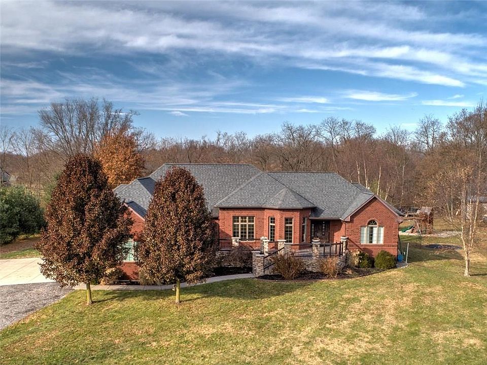 Your own private oasis!Custom built ranch,private stocked pond,acreage,pool & more!Enter through slate tile patio front entry.All wood floors & high ceilings,private dining w/custom brick wall,great rm w/floor to ceiling windows over looking your private wooded back.Custom fireplace w/open concept to kitchen.Kitchen has eatin area w/wine bar,custom cabinets w/granite,newer appliances.Plenty of windows & private exit to upper sunroom. Split BR floor plane w/master suite on main,access to sunroom,walkin closets,clawfoot tub sep shower,high ceilings.Large laundry/mudroom.Full finished bsmt walk-out w/Full bar,great rm, pool area,aquarium, office, full BR & bath,large exercise rm.Inground heated pool, slate,full outdoor kitchen,2-story outbldg