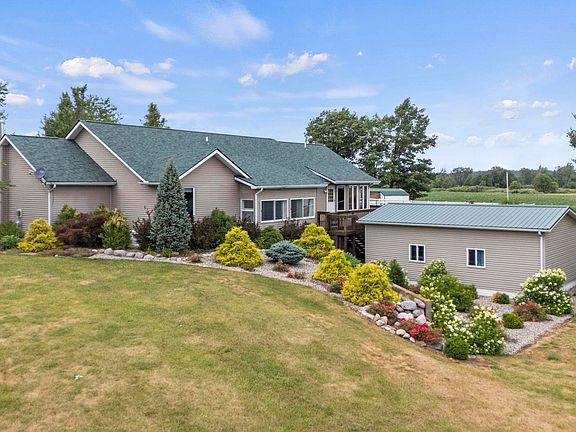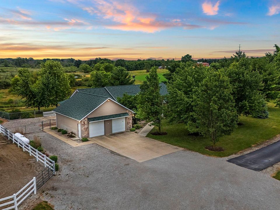 Discover this outstanding farmhouse! This custom-built estate nestled on 29+/- acres of picturesque countryside. This expansive 5,130 sq ft home features 5 bedrooms, 3 full bathrooms, and a thoughtfully designed layout that includes a main level master suite with spacious accommodations. The basement is a complete living space of its own with 2 bedrooms, 1 bathroom, a full kitchen, and laundry facilities. Every bedroom boasts a walk-in closet for added convenience. Enjoy the convenience of a remodeled kitchen (2018) with modern appliances and custom finishes, complemented by a brand new roof (2024) and well pump installed in 2018. Outside, the property offers three pole barns, 2 car detached and attached garages, and a 2,000 ft driveway leading to the residence. Additional amenities include a stalled pole barn, riding arena, solar panel system (2018), backup 22KW generator, and a 600 sq ft detached spa room with a swim spa, perfect for relaxation. Embrace unparalleled views and privacy in this meticulously maintained rural retreat.