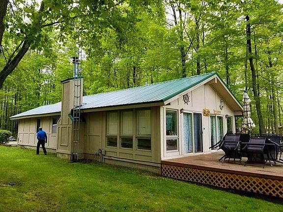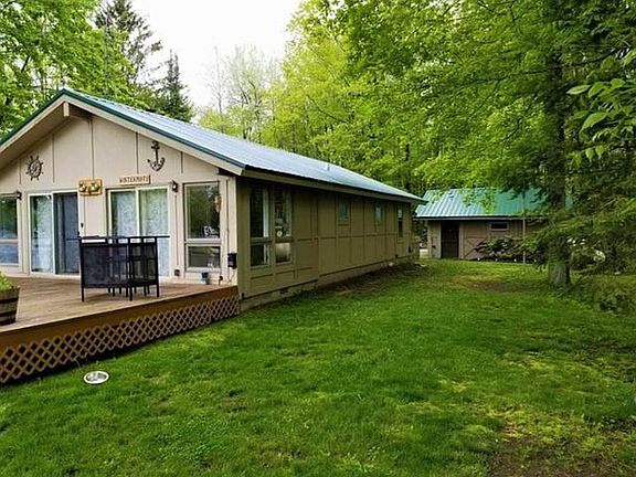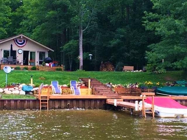 Adorable cottage or full-time home on all-sports Secord Lake! This 3 bedroom, 2 bath home with a great open floor plan is perfect for entertaining with cathedral ceilings and windows all around; perfect for taking in the gorgeous water views. Enjoy the cozy wood-burning fireplace for those chilly nights and central air for those hot summer days. A door wall leads to the large waterside deck plus extensive waterfront decking that fronts the dock and steel seawall for plenty of space for outdoor entertaining. Newer updates include an expanded wood entry deck, steel roof, hot water heater, whole house water filter, knotty pine wall accents and solid pine doors with wide knotty pine trim throughout. The nicely landscaped lot features invisible fencing for your furry friends, as well as a 2 car garage for storage. Make this your "home away from home" at a very affordable price.