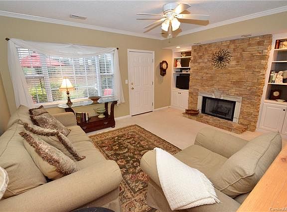 This lovely home shows beautifully and has been meticulously maintained. The covered front porch is a cozy and welcoming spot. Upon entry, you will notice how spacious and open this floor plan is. Wood floors in the foyer, kitchen, dining area and powder bathroom. The focal point of the great room is the stunning stone faced fireplace. The fireplace has built-in bookcases on both sides. These provide great storage as well as the perfect spot to display artwork, photos, and more. Recessed lights highlight both the fireplace & built-ins. The dining area is nestled between the kitchen and great room and is the perfect spot for entertaining family & friends. The kitchen is sunny and efficient and includes a cut out above the sink allowing views to the dining area and great room. Two master bedroom suites upstairs, both with private bathrooms and walk-in closets. Lovely patio outside overlooking manicured green space. Small attached storage area, New A/C 2019, convenient location. Welcome