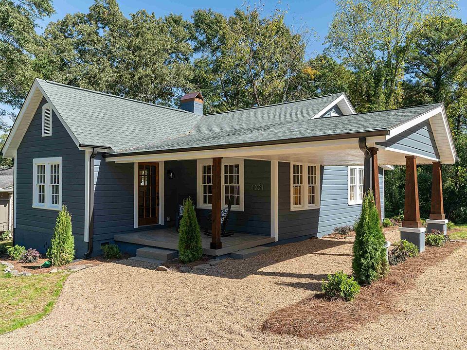 This charming three-bedroom, one-bath older home has been lovingly renovated to maintain its cozy character. The exterior features a traditional design with a welcoming front porch and a freshly painted facade. Inside, you'll find a blend of modern upgrades and vintage charm. The living room is inviting with a fireplace, now updated with floor to celling tile, as the focal point. The large windows fill the room with natural light, and the walls are adorned with neutral colors. The kitchen has been modernized with stainless steel appliances, quartz countertops, and a tile backsplash. The bathroom is a blend of old and new, featuring a tiled tub/shower combo with two vanities. The three bedrooms offer ample space, with hardwood floors and plenty of windows. The backyard is a serene retreat with a stone patio and a firepit for outdoor entertaining. This home is a perfect blend of classic character and modern comfort, offering the best of both worlds for its lucky inhabitants.