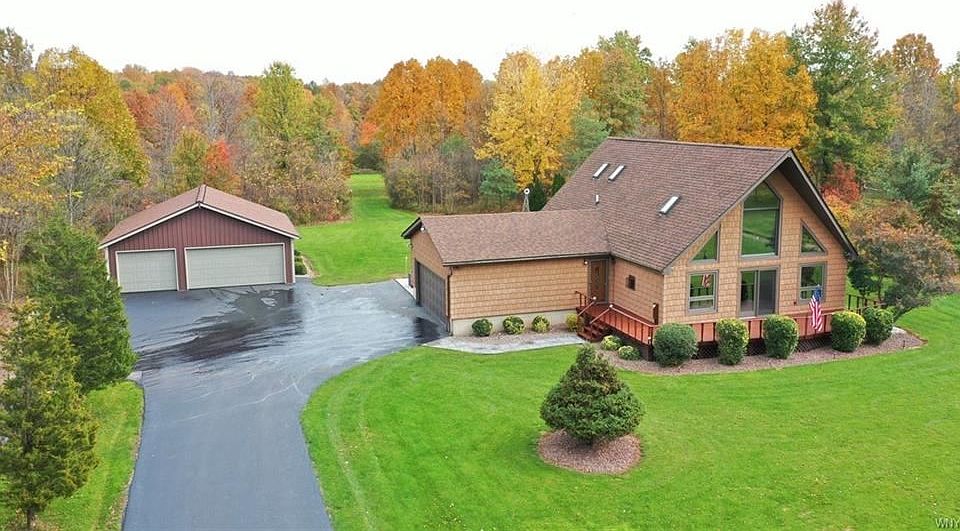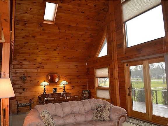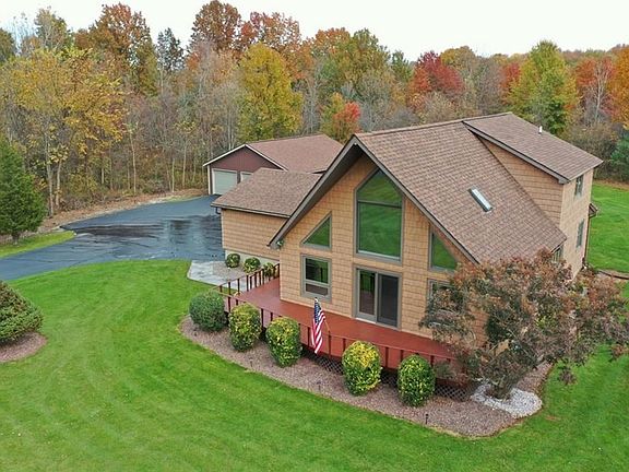 VR Priced -Seller will consider offers between $349,000 and $379,000. Spectacular A-frame house with open floor plan, vaulted ceilings, skylights & log interior. Located on 4.8 beautiful acres. Featuring a gas fireplace, gleaming kitchen with breakfast bar that overlooks the great room with ceiling to floor windows. 2nd floor boasts an open loft and a huge master bedroom with on suite bath including a whirlpool tub and separate shower. This enormous master also has a balcony that overlooks a private yard and patio. Attached heated garage. Separate 960 sq. ft. pole barn w/electric and workshop. This 3 bed 2 full bath home has been meticulously maintained by one owner. Additional .52 acre lot is negotiable.