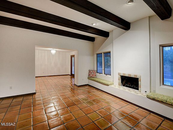 Incredibly charming single story .57 acre home nestled in the heart of the Catalina Foothills. Relax in the large living space with a center gas fireplace, exposed wood beams, custom niches, window benches, Saltillo tile floors (recently resealed) & no interior steps. The dining area is located adjacent to the kitchen & has a wet bar with custom hand painted tiles, convenient shelves & cabinets for storage. Whimsical kitchen with cheery yellow painted cabinets, a butcher block center island, a darling corner beehive fireplace, cozy breakfast nook, granite countertops, desk area, stainless steel appliances & French door refrigerator. The primary bedroom suite offers separate his & hers closets, dual vanities, walk-in shower & brand new carpeting. Incredibly spacious park like backyard is perfect for entertaining with a refreshing pool, covered patio and ramada with beautiful stained glass. Two car attached garage offers plenty of storage. Fresh paint! Award winning District 16 Schools. Close to premier shopping at La Encantada, fantastic restaurants, world class golf, hiking & biking trails. Welcome home!