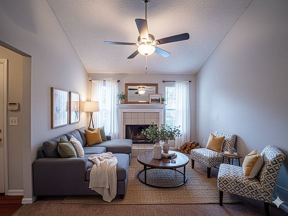 Open-Concept Living Room with vaulted ceilings, a cozy fireplace, and natural light.