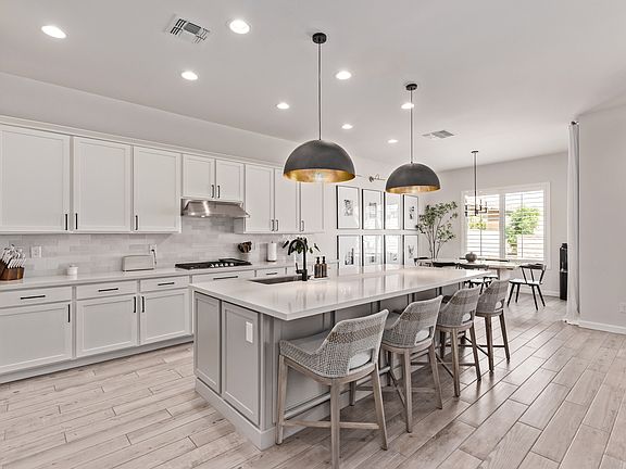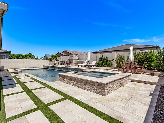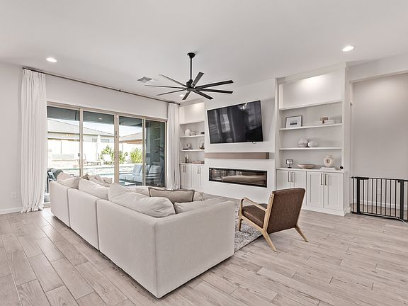 Welcome to your new home in the heart of Eastmark, one of the East Valley's most desirable communities! This beautifully upgraded 4-bedroom + den, 3.5-bathroom property offers 2,700 sqft of high-end living space perfect for families or professionals seeking comfort, style, and functionality. Interior Highlights Spacious open floor plan with upgraded 4-panel sliding glass door and large 10 foot ceilings Custom built-in fireplace and media wall Gourmet kitchen with modern finishes Den/playroom ideal for kids or a home office Upgraded master bath with tile and elegant fixtures Recessed lighting and ceiling fans throughout Soft water whole home filtration system Laundry room with full cabinetry for added storage Built-in linen cabinets at garage entry Plantation shutters throughout Whole-home security system with exterior cameras Outdoor Living at Its Best Private backyard oasis featuring a Large 8 ft deep pool and spa Built-in BBQ and outdoor fireplace perfect for entertaining Oversized side yard with turf, great for a play area Directly across from a large green park no front-facing neighbors! Garage & Storage 3-car tandem garage with extensive built-in storage cabinetry Community Perks Located in Eastmark, enjoy miles of green pathways, parks, skate parks, splash pads, community pools, frisbee golf, and top-rated schools all just steps from your door.