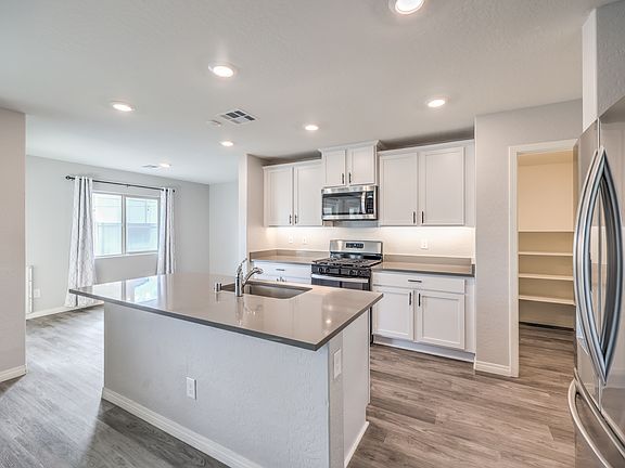 This two-story home features a stylish and functional layout with three bedrooms, two-and-a-half bathrooms, a spacious family room, a loft upstairs, and a laundry room upstairs. The home has SOLAR keeping the electric bill minimal. The kitchen features sparkling quartz countertops, underlit wood cabinetry, full suite of energy-efficient appliances, and an over-sized walk-in pantry. Most of the rooms feature a ceiling fan and TV mount. The primary bedroom features a large walk-in closet. There is a neighborhood park and dog park. The backyard has been fully landscaped and includes a built-in firepit. In addition, this home comes with designer- selected upgrades included at no extra cost such as luxury vinyl-plank flooring throughout, a Wi-Fi-enabled garage door opener, programmable thermostat and more.