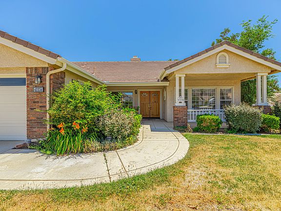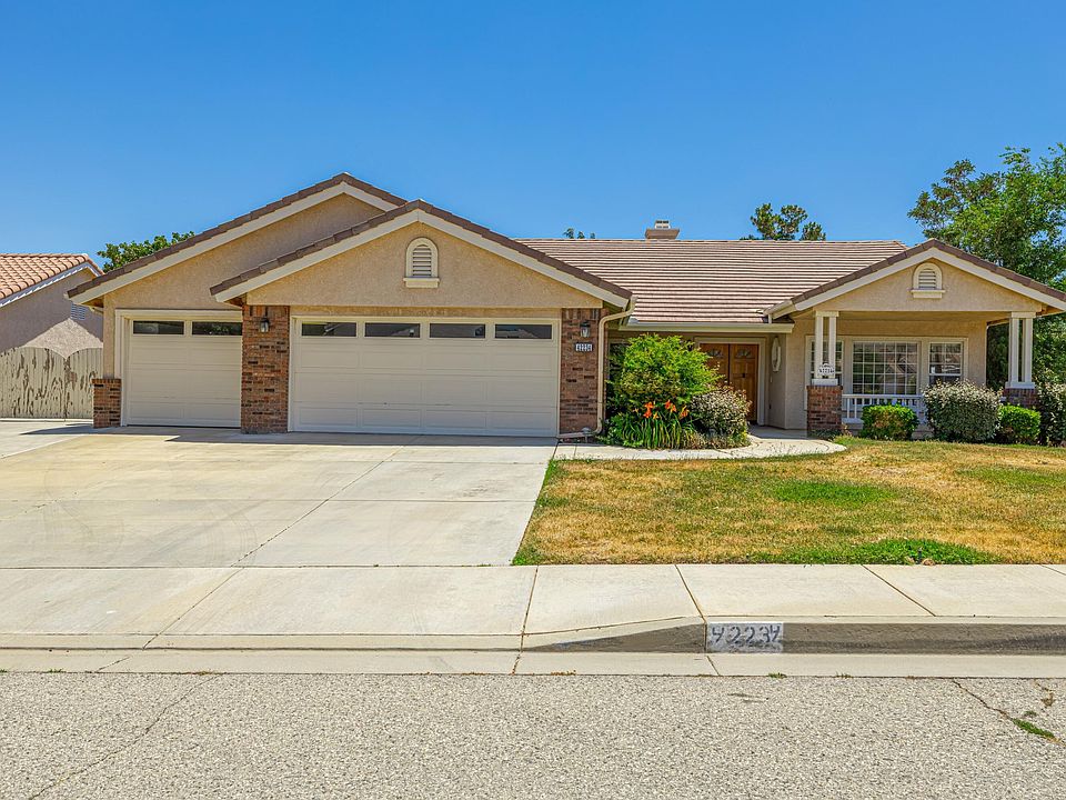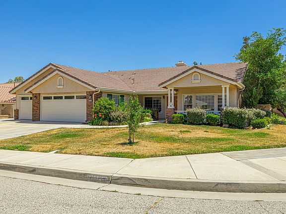 Move in ready single story on corner lot features covered porch entry, large living/dining room with wood type flooring & cathedral ceiling. Spacious kitchen with tile flooring, granite counters and room for a kitchen table. Large family room with fireplace, wood type flooring and slider to back yard that features a covered patio and block wall fencing. Corner lot is very private.There are 3 secondary bedrooms (one of which was used as an office and has no closet) plus two full baths off the hall. The sizable primary bedroom has high ceiling with ceiling fan, large en suite bath with separate tub and shower, dual sink vanity plus large mirrored door walk in closet. There's also a laundry room that has access to the 3 car garage. The garage has roll up doors with openers and plenty of storage cabinets. To top it all off there's paved, gated RV access.