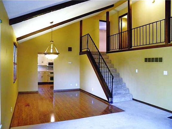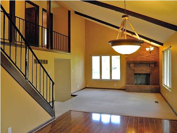 All dressed up with brand new vinyl siding, a freshly painted deck and a new roof over the garage this 3 bedroom, 2.5 bath home is ideally situated on 1.11 acres at the end of a no outlet street. All of the interior has been freshly painted except for the Great Room and the upstairs hall. The Great Room features a vaulted, beamed ceiling, wood burning fireplace and a dining area with pretty wood laminate flooring. The wood laminate flooring was installed in 2009 and continues into the Kitchen. The Kitc hen has an abundance of prep and cooking/baking space with a double oven, lots of cabinets and countertops, a planning desk and a pretty corner window over the kitchen sink perfect for keeping an eye on the kids playing in the backyard. Enjoy movie night in the large family room with French doors that lead out onto the oversized deck. There is also a half bath and laundry/mud room with pretty tile laminate flooring accessible from the deck. Upstairs you will find the Master Bedroom with a private full b ath, two additional Bedrooms and another full Bath. All three bedrooms have ceiling fans as do the kitchen and family room. In 2009 most of the light fixtures, carpeting, wood laminate and tile laminate flooring was updated. The large Rec/Play Room in the semi finished basement offers another space for the family to spread out while doing different activities. The walls and ceiling are drywall and the floor is painted concrete. The perimeter of the large backyard is lined with trees for privacy and there is a fenced in area for a pet. Sellers are providing a home warranty for buyers peace of mind.
