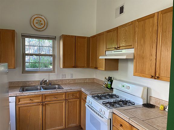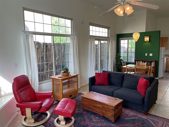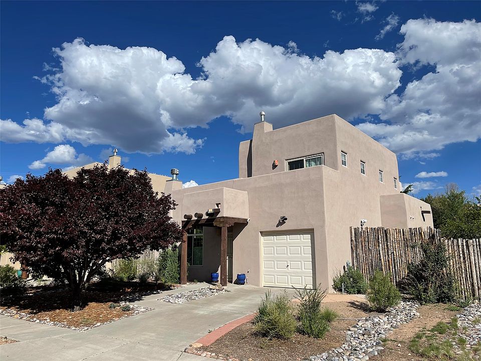 Live your dream in the Land of Enchantment in this lovely light-filled 3 bedroom, 2 bath home! Primary bedroom with full bath on the main level, high ceilings in the open living area and kitchen, clerestory windows, beautiful gardens front and back, fully fenced backyard with side gate. Sunset views of the Jemez from the upstairs deck. Attached 1-car garage with newer automatic opener is finished and insulated, and boasts an attached indoor storage area. Newer roof, stucco, HVAC system, upstairs deck, most windows and patio doors; wood-burning fireplace with raised hearth; living room recently painted. Easy access to walking paths.