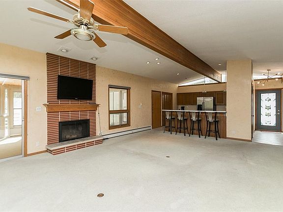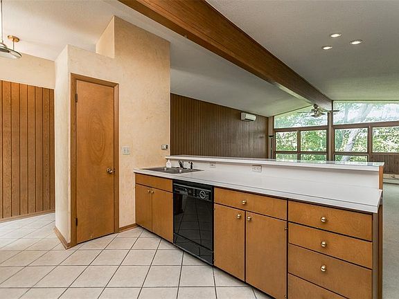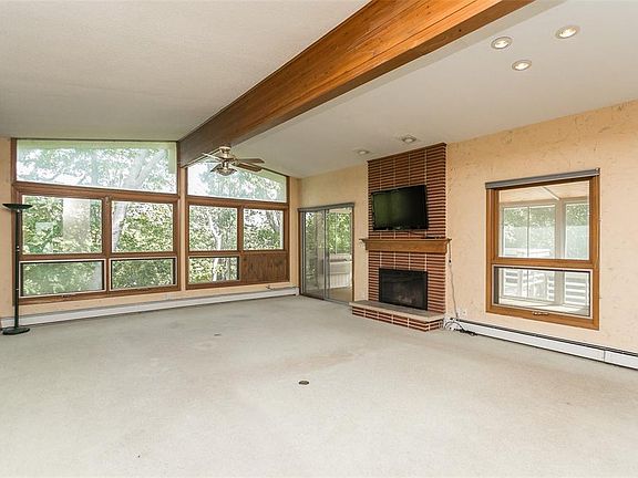 This true blue mid century modern home may need a little updating however, once done will shine like the true gem that it is! Located at the dead end of a quiet street with a wooded backyard and newer two car garage. New membrane roof, due to the derecho. Fireplace in the open concept great room with vaulted ceilings and access to the large three seasons porch and two decks. Original kitchen cabinetry, stainless steel appliances and laundry at your fingertips in the main floor. Updated main bath, three nice size bedrooms and the master bath has been updated also with a walk-in shower. The unique basement would be an excellent space for a woodworker or artist studio, *approximately 570 sq ft. (walls finished) If you're facing the house, walk around the right side of the house, down the steps and along the back to get to the basement. Home is being sold "as is" as the owner is in a care facility out of state.--