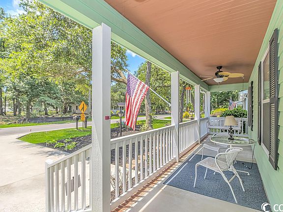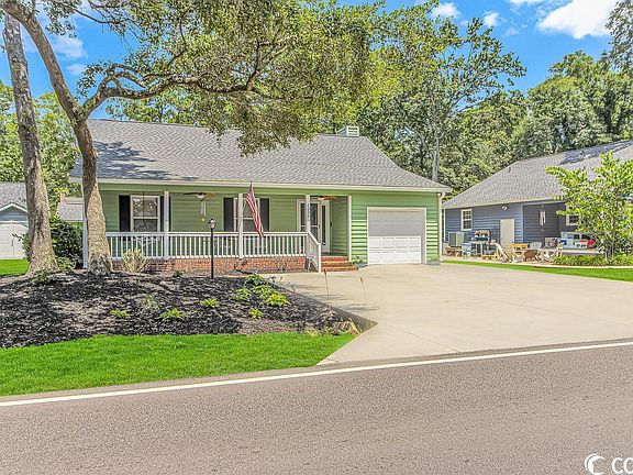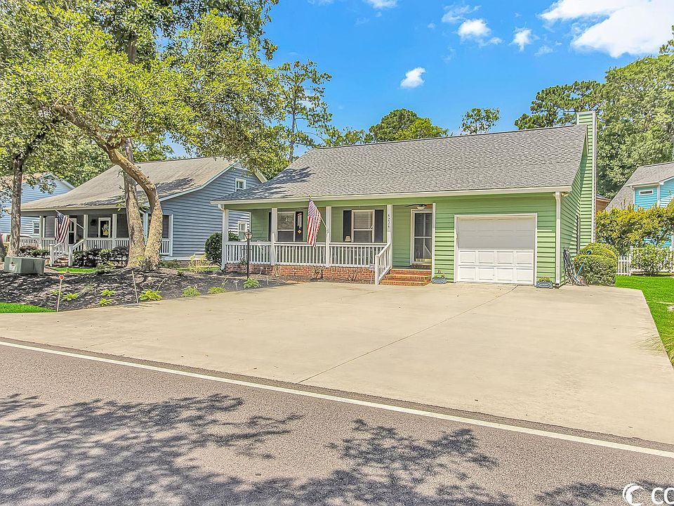 It's ALL about the LOCATION! This 3 bedroom, 2 bath home has been lovingly maintained, is being sold furnished and is located in the heart of Murrells Inlet. A large front porch complete with rockers and a porch swing welcome you as you enter the home. Inside you will fine a tiled entry and gleaming hardwood floors in the family room and kitchen. The sunlit family room boasts a fireplace and is open to the dining area off the kitchen. French doors open from the dining area to a large deck area perfect for entertaining and relaxing. The kitchen comes fully equipped with white cabinetry and all appliances. Completing this home are two secondary bedrooms with spacious closets and hall bath. The roomy primary is complete with a large walk in closet and private bath. Outside features a fenced backyard, detached storage building, and attached garage. A new roof was installed in 2021 and the deck was added in 2022. Hurry and schedule an appointment so see this move in ready home!