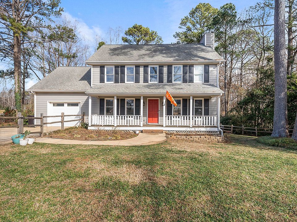 Gorgeous updated home on 0.81 acres! Welcome guests to your rocking chair front porch and step into a freshly painted, move-in-ready, light-filled floor plan. Updates include new LVP flooring, a remodeled owner's suite bath, secondary bath, new carpet, and a roof installed around 2014. The home features a great kitchen with stainless steel appliances, granite countertops, and a tile backsplash, along with a formal dining room, breakfast nook, family room with a wood-burning fireplace, and laundry. Upstairs, you'll find a spacious owner's suite with a remodeled bath and new vanity, plus two additional large bedrooms and a secondary bath. Outside, enjoy an amazing entertaining deck and patio, along with a hard-to-find, usable backyard complete with established perennial garden beds. The property includes a one-car garage and is conveniently located near shopping, 540, and restaurants. Best of all, there's no HOA!