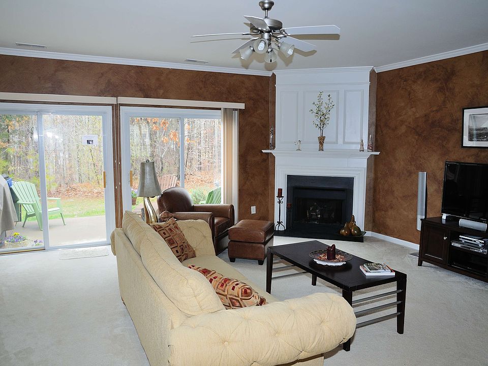 Quiet and private END UNIIT backing up to woods in highly desirable NW Raleigh n'hood. Designer paints, plantation blinds, new A/C, all new lighting fixtures, hinges and knobs. Large 20x20' living room w/corner gas log fireplace and 2-double sliding doors onto rear patio, white cabinets, smooth top range, microwave, mstr cath. ceiling, very low HOA dues , extra flooring in attic .
