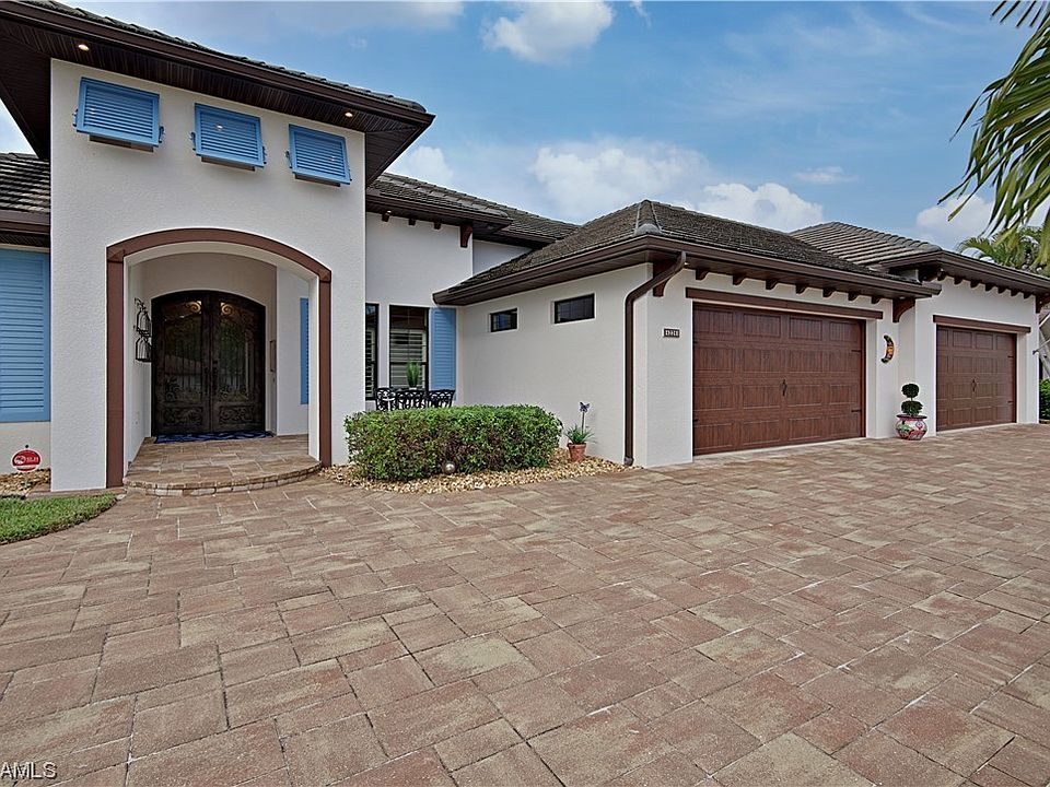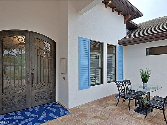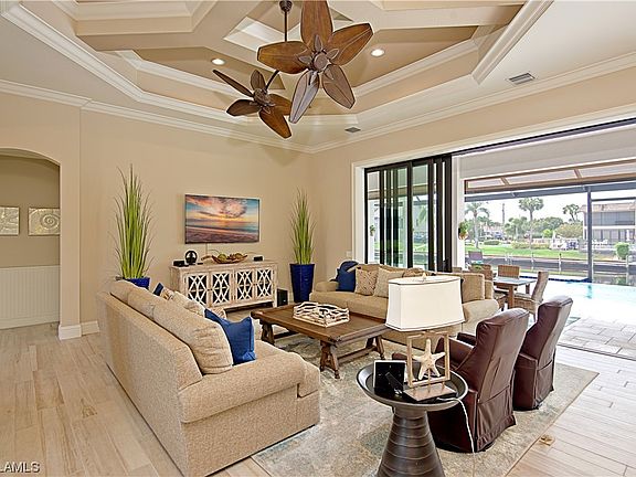 Gorgeous turnkey Custom-Built Gulf Access Home on oversized southern exposed lot. 4 Car garage with AC, Epoxy flooring, walk in trusses. Circular driveway with pavers. Entering thru the Custom Iron double doors into the great room tray ceiling, crown molding, tile plank floors. Study that can be used as 4th bedroom w/custom barn doors. Dining, bar, wine frig. Gourmet kitchen equipped with professional grade appliances, Miele, Gas Stove, custom designed cabinetry, pantry, oversized Island. Owner’s Suite with canal view, walk in closet, dual sinks, soaking tub, rain shower, custom mirrors, laundry chute, custom barn door. Two guest bedrooms crown molding, large closets, Guest bath walk-in rain shower. Laundry room with ample counter, sink, cabinets. Enjoy breathtaking sunsets in the outdoor area, heated saltwater infinity pool w/ sun shelf, storm smart hurricane shades, pool bath, shower, gas fire pit, Travertine tile, hot tub, outdoor kitchen. Disappearing zero-edged corner sliding doors, custom blinds, drapes, impact windows/doors, generator, concrete tile roof, on demand water heater, soft water filtration, safe, new sea wall & sand beach.