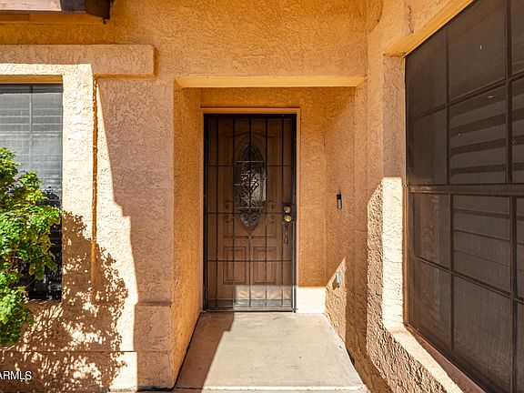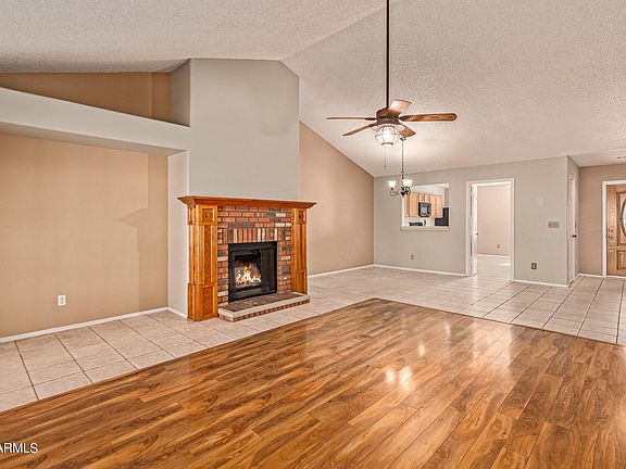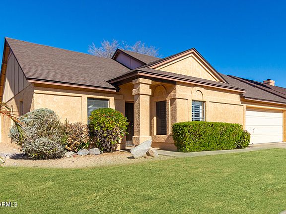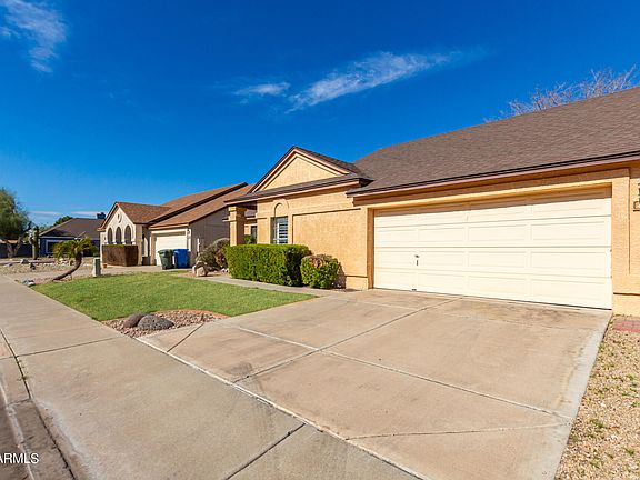 Welcome to this charming residence, where comfort meets style! Feel immediately at home in the warm and inviting great room, accentuated by vaulted ceilings, plantation shutters, tile and laminate flooring, and a cozy fireplace. The eat-in kitchen features ample cabinets, built-in appliances, and a pantry. Split main bedroom is a peaceful haven offering a spacious walk-in closet and a private bathroom with dual sinks, a glass enclosure shower, and a soothing tub. Spare bedrooms have new carpet and fresh paint. Sizable backyard is complete with a covered patio and lush grass, creating an ideal setting for a variety of fun outdoor activities. Walking distance to Six Flags Hurricane Harbor and close to Thunderbird Conservation Park for hiking. This home is sure to captivate!