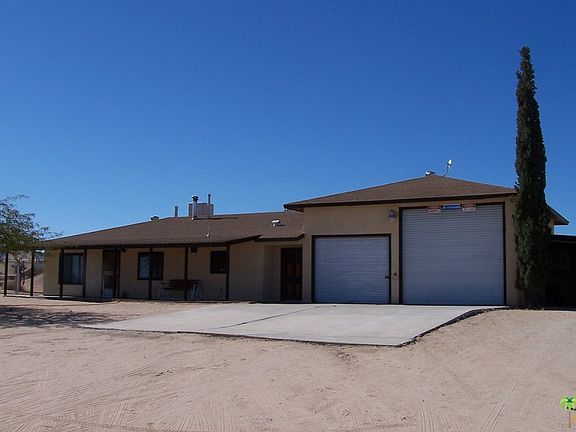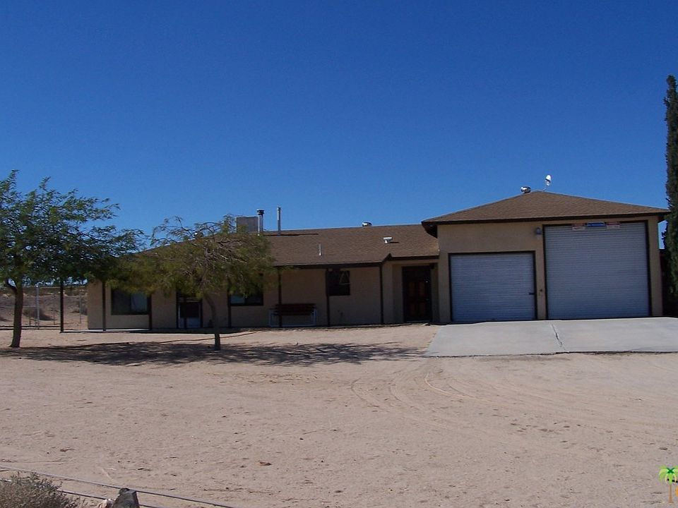 This is a great 2 bed. 1 bath Custom Built Home sitting on 2.15 Acres. This home is secluded with fantastic views of the surrounding hills and mountains. It is 1.3 miles off of a paved road, The home is on City water and underground power. It has a large living room and Kitchen with cabinets galore. The attached two car and RV garage is huge. The back yard is fenced for dogs, there is a unpermitted cabin with a kitchen and a separate bath and shower. There are also two storage units. This home is ready for move in and even comes with furniture and appliances. You can be in downtown Twentynine Palms or Joshua Tree in about 15 minutes for all your shopping needs, eateries, the Casino and both ways into the National Park. The new Central Air and Heat was put in about 3 years ago. This one is a must see. Don't Wait - Call Now!!