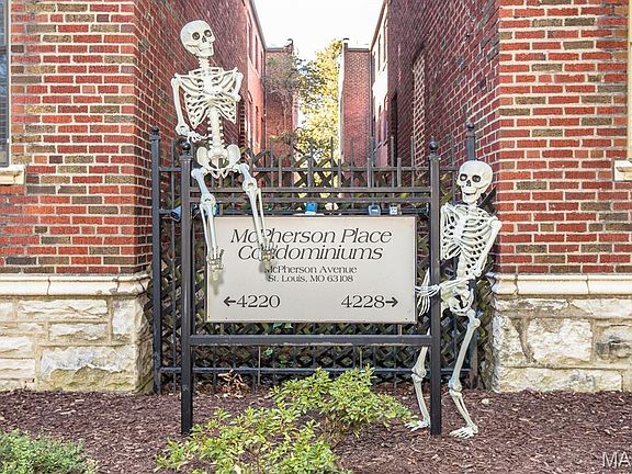 Definitely not Haunted, or is it? This 2 bedroom 2 bathroom condo unit has secured gated parking. The kind of parking city dwellers are dying to have. Think of the fun and friends and family gatherings you could have in the open kitchen and living room area talking about all the St. Louis City sports teams and current happenings in the CWE. Huge primary bedroom with walk in closet and dual vanity and sinks. New upgraded windows on this entire side of this unit. Creepy clown's stare at these beautiful windows is a little too long to be comfortable, but he's really admiring those new windows. The 2nd bedroom is spacious with plenty of room for all your........activities.....or hobbies......or whatever you're into. Awesome common area to gather and enjoy the weather, BBQ, or just relax and chat about all the cool festivals and parades the city offers like the St. Paddy's Day parade. There's even enough space for any little ones to enjoy the private back common area. Check out this unit today before we've summoned the next new owner to enjoy it.