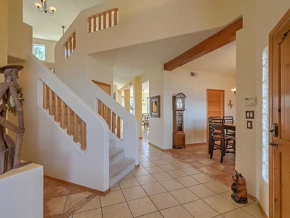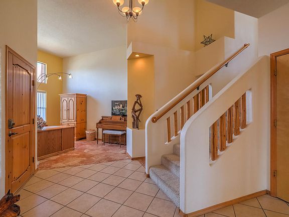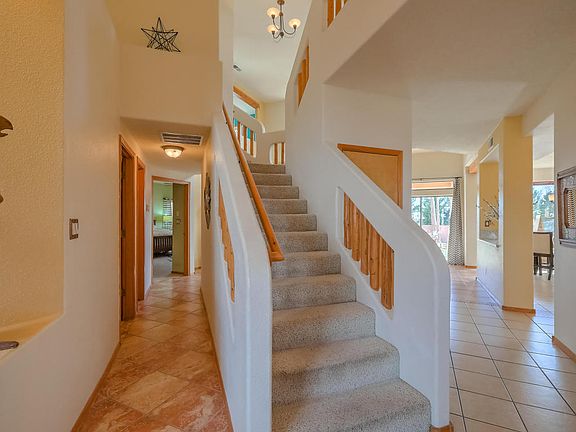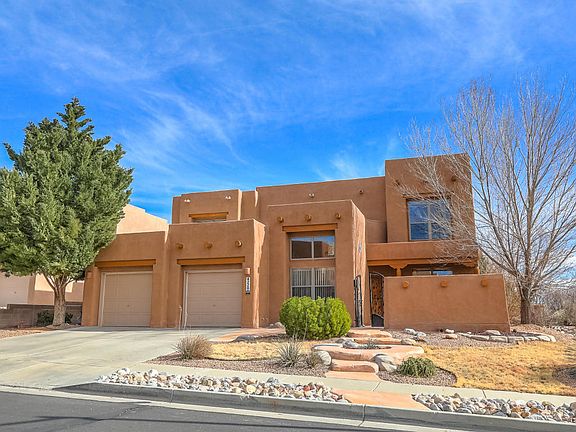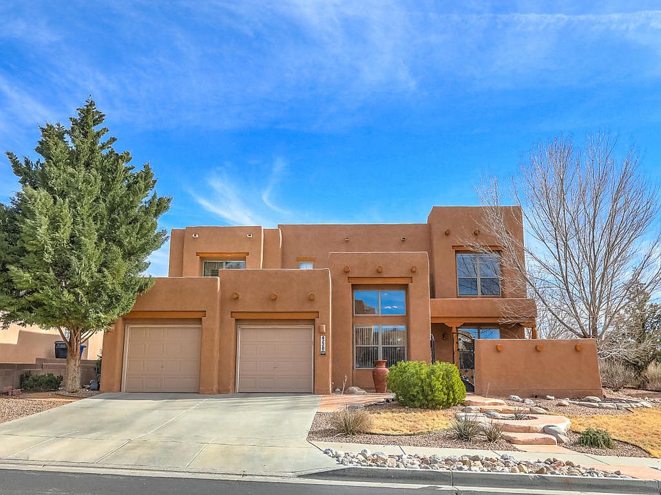 This house is a Southwestern Charmer! Enter through a fantastic courtyard into a high ceiling foyer. The stairs are a New Mexico Masterpiece with vigas leading the way. Downstairs are two living areas, a formal dining room and and eat in kitchen. The Master Suite is also downstairs, providing extra privacy. Upstairs are three more bedrooms a loft. There is a lovely balcony upstairs from which you can enjoy our beautiful sunsets. The garage is finished and fantastic with epoxy floors. The yard is private boasting tall trees and grass and several raised planters and a covered patio. The flooring is an easy to maintain tile and newer carpet. Located close to the Cottonwood Shopping centers and convenient to Paseo del Norte, this house has it all.