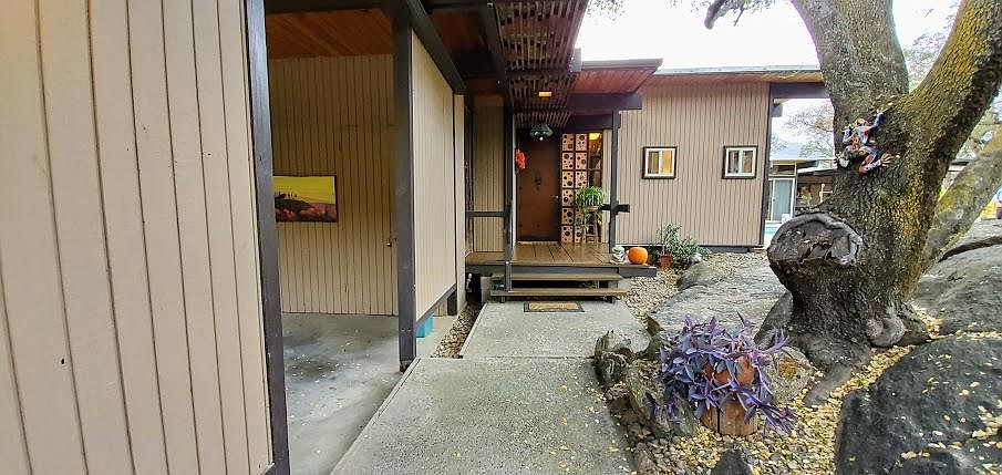 This Frank Lloyd Wright like design home will give you and your guests great joy as you experience the gorgeous, spacious home. It's open design of the kitchen to the family room gives it even more of an expansive feeling. You will be amazed constantly of the mountain vistas and beautiful oaks that form tree house views from most rooms of the residence. Enjoying the fireplace is simple - turn the switch and it's providing fabulous flames. The designer carefully provided lots of storage throughout the home. The kitchen is a dream with lots of space, an island, and massive Corian counter tops. The master suite has two separate sinks, tub, separate shower, & cabinets. You'll wake-up to tree top views from two sides of the room. The 1/2 acre property furthers your feeling of space with the several patios, beautiful pool and 360 degrees of views. Three bedrooms, 2 bathrooms, ceramic/porcelain flooring. 13 month home warranty is provided by the seller. Special financing is available.