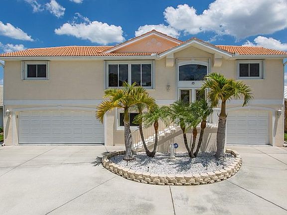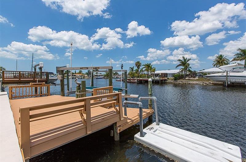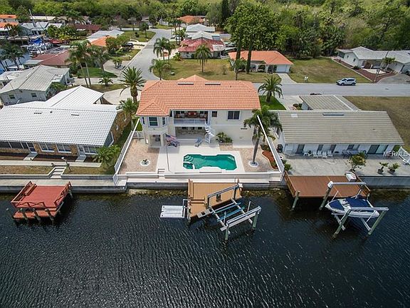 Amazing opportunity to achieve the waterfront lifestyle in a modern, elevated, pool home nestled on the main & deep South Channel of Gulf Harbors & only minutes away from the open Gulf! You'll be immediately impressed by its stately presence & lush tropical landscaping. Owner custom designed home to exceed existing building codes, provide high ceilings in every room, & embrace the waterfront view! Open Grand Room plan w/ quality tile. Bathed in natural light w/ over-sized windows low to floor providing unobstructed water views! Large Living Room flows out to balcony providing an amazing location to relax, watch the boats & dolphins, & enjoy the gentle gulf breezes. Convenient spiral offers direct access to pool deck! Kitchen boasts Corian counter tops, solid wood cabinetry, quality appliances, eat-in area, & generous breakfast bar. Spacious Master Suite boasts water views, large walk-in closet, & private Master Bathroom w/ double vanity & large walk-in shower w/ glass block wall. Gracious Guest Bedroom is served by a full Guest Bathroom w/ Garden Tub. Den offers wonderful water views & has a spacious closet giving you the option of using as third Bedroom! You'll discover a convenient full, pool Bathroom on the ground level. The 4+ car garage offers abundance of space to around double doors leading out to covered lanai & pool deck to make an additional 400 sqft Rec Room/In-Law Suite! Entertain guests by the waterside pool w/ spill-over spa! Large dock offers high capacity boat lift & drive-on jetski lift.