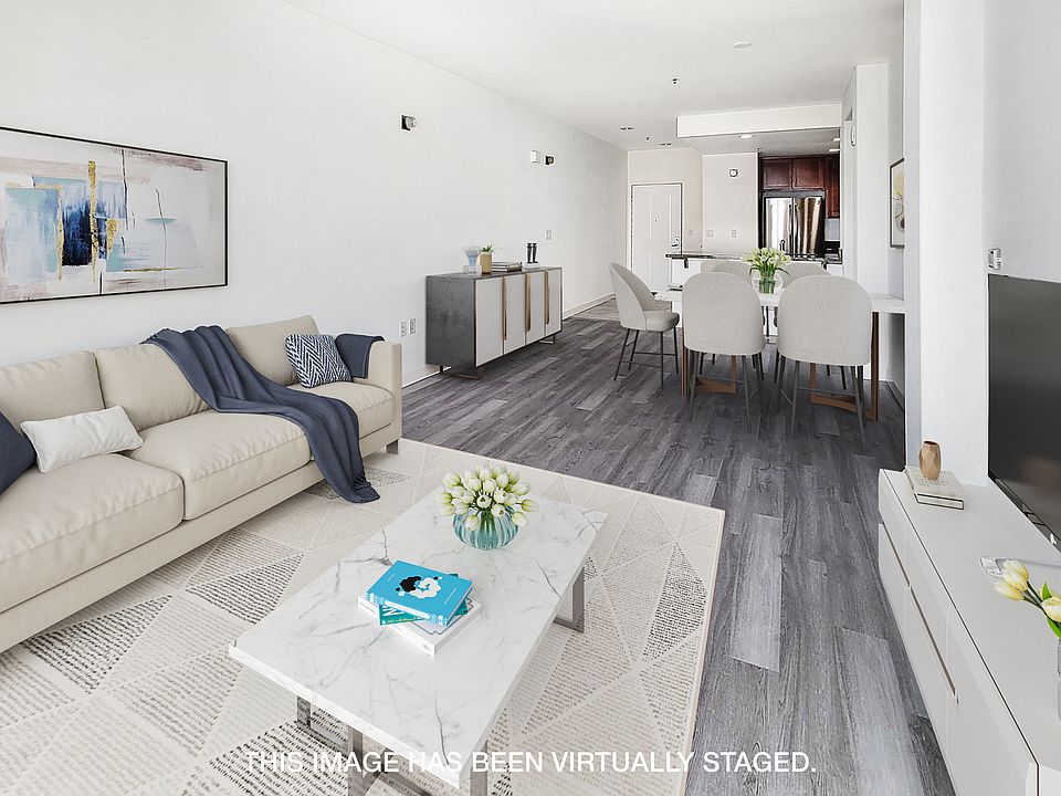 Stunning 1-bedroom, 1-bath condo on the 1st floor of the 8 Orchids complex. Recently updated with luxury vinyl plank flooring and fresh paint, this spacious unit features high ceilings and an open floor plan, flooded with southwest facing natural light. The living room opens up to a private balcony. The modern kitchen boasts a large granite countertop, gas stovetop, stainless steel appliances, and tile flooring, ideal for cooking and entertaining. The bright bedroom offers a spacious walk-in closet, while the full bathroom includes a granite vanity, shower over tub, and tile flooring. Enjoy the rooftop garden with panoramic vistas of Oakland, San Francisco, and the Bay. The 8 Orchids complex provides gated entry, a media center, party room, courtyard, and secure parking. With a WalkScore of 99, you are steps from Old Town Oakland, Jack London Square, and Chinatown, with easy access to BART, AMTRAK, and freeways. Built in 2008, this quiet, modern building also includes air conditioning and in-unit laundry. Don't miss out on this beautiful home in the heart of Oakland! ONE YEAR MINIMUM. Negotiable there after. Owner pays water, garbage. Tenant pays electrical.