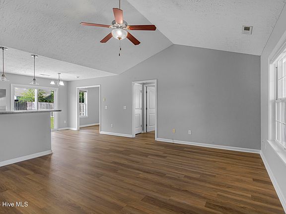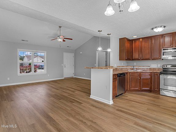 Super clean 3 Bedroom, 2 bath home with brand new wood look LVP flooring throughout main areas, bathrooms and owner's bedroom. Two spare bedrooms have new carpeting and padding. Front door opens to a vaulted living room which is open to the dining & kitchen. Kitchen has stainless steel appliances and lots of cabinetry and counter space. Immediately off the kitchen is a flex space which could be used as an office, den or for additional dining space. Separate Laundry room for hiding away the laundry. Owner's bedroom is nice with a ceiling fan, private bath and a walk in closet ad best of all...no carpet. Owner's bath has dual vanities and a tub/shower combination. Two car garage equipped with garage door opener. Large privacy fenced backyard with a concrete patio grilling area. Easy commute to all area military bases and just a short ride to Surf City, Wilmington and area beaches.