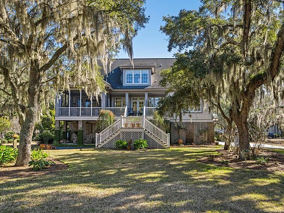 DeBordieu Colony - This Classically designed low country raised beach home sits in the gated oceanfront community of DeBordieu Colony on one of the most stunning homesites for water and wildlife. Centered on approximately .65-acres, you will enjoy expansive wrap around pond views with the DeBordieu Club’s 11th tee box in the distance. Up the front staircase takes you to an considerable porch that leads to a welcoming foyer with views throughout the house of the moss draped live oaks and golf course out the front and rear. Off the foyer is a private office on the left and a large dining room on the right. The primary bedroom, powder room, and elevator are down the first hall on the left. The primary suite is very spacious, has a sitting area and access to the rear deck, has two closets, double vanity and walk-in shower, private water closet all recently updated. On the other side of the main level is a lovely kitchen with custom cabinetry, with pull out shelving, a breakfast nook, laundry room, and screen porch. The 3rd floor hosts 1 extra-large suite and another large bedroom with a bath that also opens to a cozy den. Storage galore is a great way to describe this home. A walk-in attic runs the length of the home and there is a large walk-in closet, and storage nooks in just about each room. This is also a very flexible space that could easily be a 4th and potentially 5th bedroom/bunk room etc. The ground floor is fantastic and features 3 garage bays that could hold 3-4 cars and a cart if needed, a custom shower, a utility garden sink, storage room/workshop, more storage areas, and loads of room for carts, bikes, boats, boogey boards etc. There is also a quaint covered porch that is perfect for taking in the beauty and nature of this incredible unique spot.