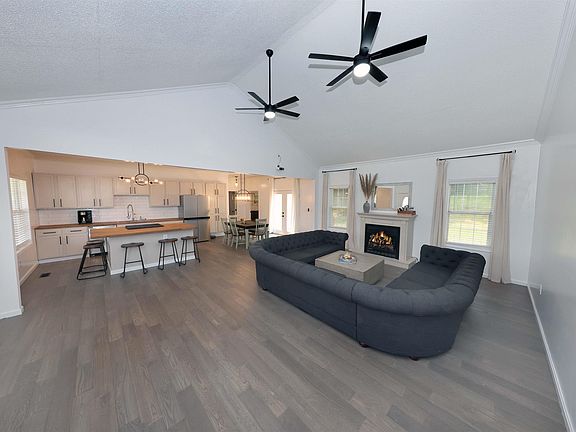 Luxury meets tranquility in the Alexandria Valley! Impress with an open-concept living area featuring vaulted ceilings and seating for 22. Entertain effortlessly with a wraparound island, dual-zone beverage cooler, gas range, acacia butcher block countertops, stainless appliances, and French doors to the back deck. Custom cabinetry includes a robo-vac docking station. Smart home features: Nest thermostat, Ring doorbell, and fingerprint touch lock. All bedrooms offer 9’ ceilings and walk-in closets. Enjoy crown molding, new lighting, fresh paint, and engineered hardwood throughout. The luxe ensuite boasts a soaker tub with filler, bidets, towel warmer, double vanity with vessel sinks, and waterfall faucets. Bonus: built-in wall safe and 2-story 2-car garage! Set on a peaceful wooded road in the Alexandria School District. Micro-orchard includes blueberry, peach, apple, black walnut, and plum trees. Lofted storage building and carport included