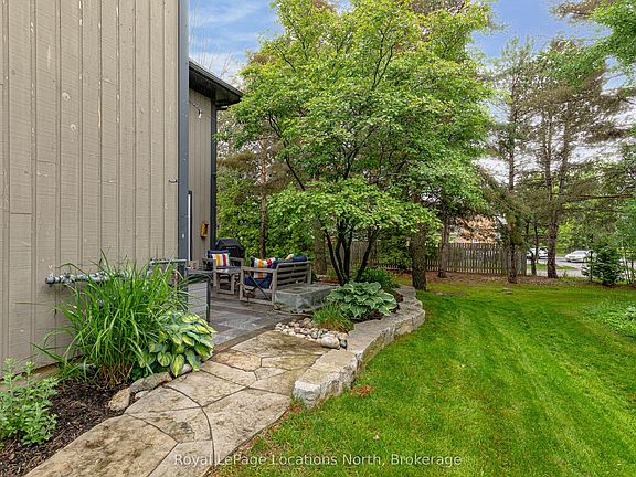 Welcome to Lighthouse Point! Discover this rarely available 3-bedroom Garden Home, ideally located near the clubhouse in one of the most sought-after communities. Out of 576 residences, only 17 feature the coveted Zinnia floor plan. This spacious ground-level home offers 1,326 sq. ft. of open-concept living space, complete with a cozy gas fireplace and an abundance of pot lights.Enjoy outdoor living with a large private terrace, and the convenience of an attached garage. Thoughtful landscaping enhancements were completed in 2020, including a stone walkway to the garage and an armour stone retaining wall. New patio stones were added in 2024 for a refreshed outdoor feel.The kitchen and living area were beautifully renovated in 2019, featuring modern finishes, quartz counters, a built-in Liebherr refrigerator, gas stove hookup, and durable laminate flooring throughout. A high-efficiency Navien on-demand hot water and boiler system, along with an A/C unit, were also installed in 2019 for year-round comfort. Residents enjoy access to an array of resort-style amenities, including two private beaches, a marina, indoor and outdoor pools, a 16,000 sq. ft. recreation centre, tennis and pickleball courts, scenic walking trails, and more. Whether you're seeking an active lifestyle or a peaceful retreat, this home offers the best of both worlds.All just minutes from downtown Collingwood, Blue Mountain, and several top-rated golf courses.