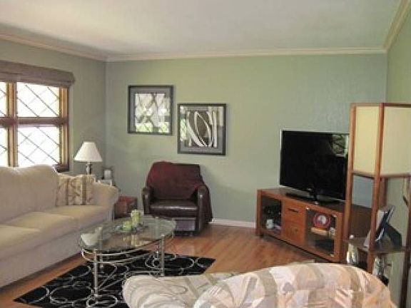 This is a beautiful split level house with three bedrooms, 2 bathrooms, a beautiful living room with crown molding, a gorgeous kitchen with beautiful