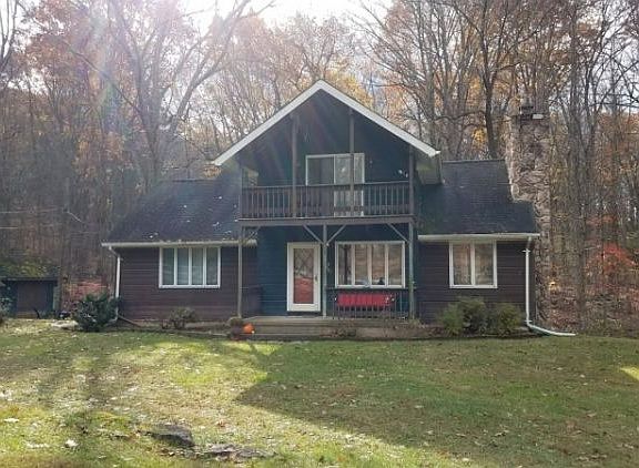 With some TLC you can make this your dream home in the countryside! Set on 6.44 gorgeous acres with a stream, open meadow and woodlands connecting to Point Mountain Reservation. Nature lovers, enjoy hiking for miles right from your back door. Home offers 2 bedrooms, 2 full baths, living room dining room combo, family room, kitchen, and 3-season sunroom. Cathedral ceilings in living room dining room and family room. Covered balconies off both bedrooms. Master bedroom balcony has private view of stream, meadow and woodlands. Covered front porch and large back deck with space for above ground swimming pool. Full basement with walkout and high ceilings used as a workshop. Sold as is.