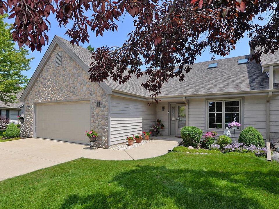 Condo Living at its best! Beautifully landscaped side-by-side has many updates and amenities. Entertain in the open concept living and dining rooms where vaulted ceiling gives a spacious feel. Be casual in the updated kitchen and second space currently used as a dining area or sit by the counter on stools. Comfortable living with the walk-in closet, walk-in shower, and jet tub off the main bedroom. The second bedroom offers endless possibilities. There is also a loft with dual skylights. Step out of the sliding door to the patio overlooking green space for natural views whatever the season. In cooler weather be cozy by the convenient gas fireplace in the living room. First floor laundry is off the two plus car garage with built in storage space. One year home warranty included thru HSA.