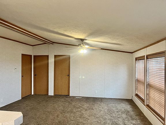 - Description: Ceiling fan, vaulted ceiling, carpet. Open to kitc