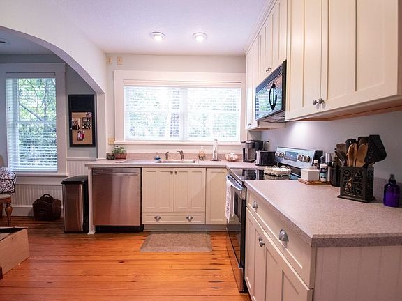 Quaint cottage in downtown Kingsland that is simply charming. This 2 bedroom 1.5 bath was built in 1945 and still has the original wood floors. The updates in this brick beauty are priceless. Porcelain tile and cedar closets are just a few of the special touches. Beautiful open kitchen with double windows over the kitchen sink that lets the natural light in. Eat in breakfast nook as well as a spacious dining room area. The lot is almost 1/2 acre and you can enjoy the peacefulness of the private wooded backyard from your covered porch.