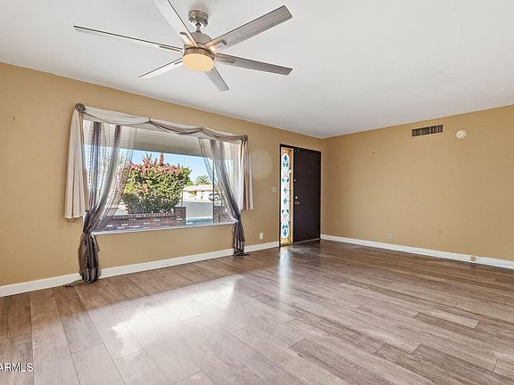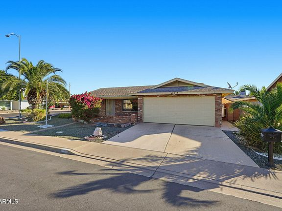 This home is located in the highly sought-after 55+ community of Sunland Village! It is a 2-bedroom, 2-bath home plus den which offers a comfortable and inviting layout in a prime East Mesa location—close to shopping, dining, golf, parks, and easy freeway access. The kitchen features granite countertops, custom tile backsplash, stainless steel wall oven, and ample cabinetry for all your storage needs. The spacious primary suite is light and bright, complete with double sliding door closet spaces and walk-in shower. The guest bedroom provides direct access to the backyard, while the den is perfect for a home office, craft room, or flex space. Step outside to enjoy your covered patio, low-maintenance artificial turf, and mature citrus trees—ideal for relaxing or entertaining. Additional highlights include ceiling fans throughout, a two-car garage with built-in storage and a workshop area, and a front security door for added peace of mind. Residents of Sunland Village enjoy access to a community clubhouse, golf course, fitness center, swimming pools, pickle-ball and tennis courts, and a variety of social clubs and activities. Don't miss this charming home in one of Mesa's most established active adult communities.
