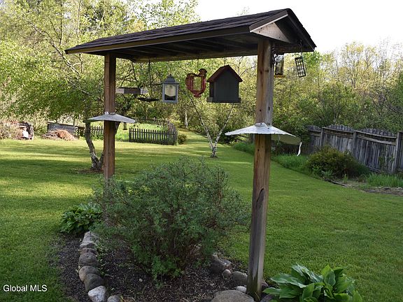 Outside, the fenced-in yard is a gardener's paradise, featuring mature flower gardens as well as a small orchard of fruit trees,