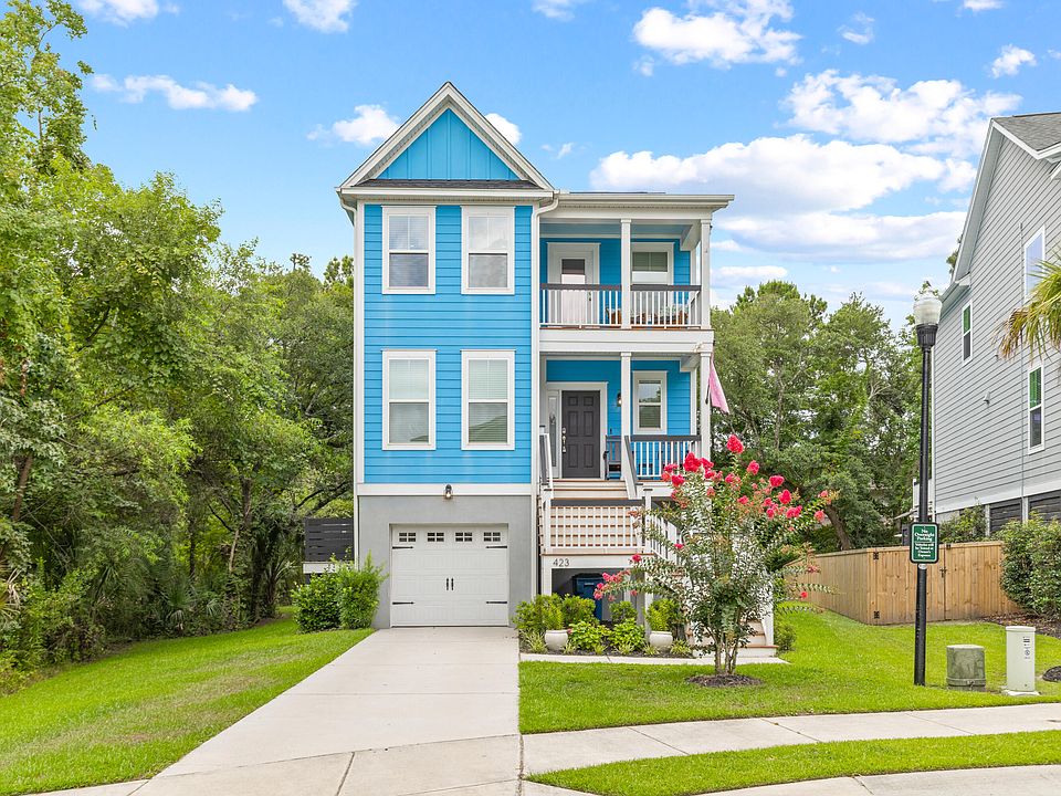 Welcome home to 423 Topsail Court, situated right off the banks of Nowell Creek and the Wando River! Only 2 miles separate you from prestigious Daniel Island, and less than 15 miles from the beach and Downtown Charleston! As you enter this amenity packed luxury community, you will quickly see why 423 Topsail is ''THE ONE.'' Located at the end of the cul de sac, this elevated home boasts over 2100 square feet of like new living space. Upon entering the home, you are greeted by beautiful hardwood floors and 9'+ ceilings. An open floor plan allows for a seamless transition between your home office/formal dining room, a coffee bar, the gourmet chef's kitchen, a walk in pantry, the living room, and a half bath. A sliding door just off the eat in kitchen opens up to a large screened in porch--perfect for entertaining, or a quiet place to enjoy a coffee and a good book. As you walk upstairs, you will find a large loft area that could also serve as the perfect flex space; home gym, office, playroom--the possibilities are endless! Just off the loft is another porch where you can sit a spell solo or with company. Also upstairs is a laundry room, a full guest bathroom complete with dual vanities, and 3 large bedrooms including the owner's suite. The owner's suite boasts a large walk in closet, and the primary bathroom features dual vanities, a beautiful walk in shower and a tub! Beneath the home is a 2 car drive under garage with ample space for storage and a utility sink. Potential to finish part of the garage for additional square footage is there. The large backyard provides yet another area to entertain guests with a covered patio space. The HOA allows for boat storage in your driveway or besides the home. The area to the left of the home is protected HOA green space, which means you will never have neighbors on that side. Oh yeah, I did mention the Landings at Sweetwater is absolutely jam packed with luxury amenities, right? Of these are a resort style pool overlooking deep water, a gorgeous clubhouse with full kitchen and media center, a boat landing, a firepit area on the marsh, outdoor grills, a dog park, a 24 state of the art fitness center, a community dock, a kayak launch, walking & bike trails, and boat & RV storage space. So what are you waiting for? Schedule your showing for 423 Topsail Court today and see why this home truly is "THE ONE."