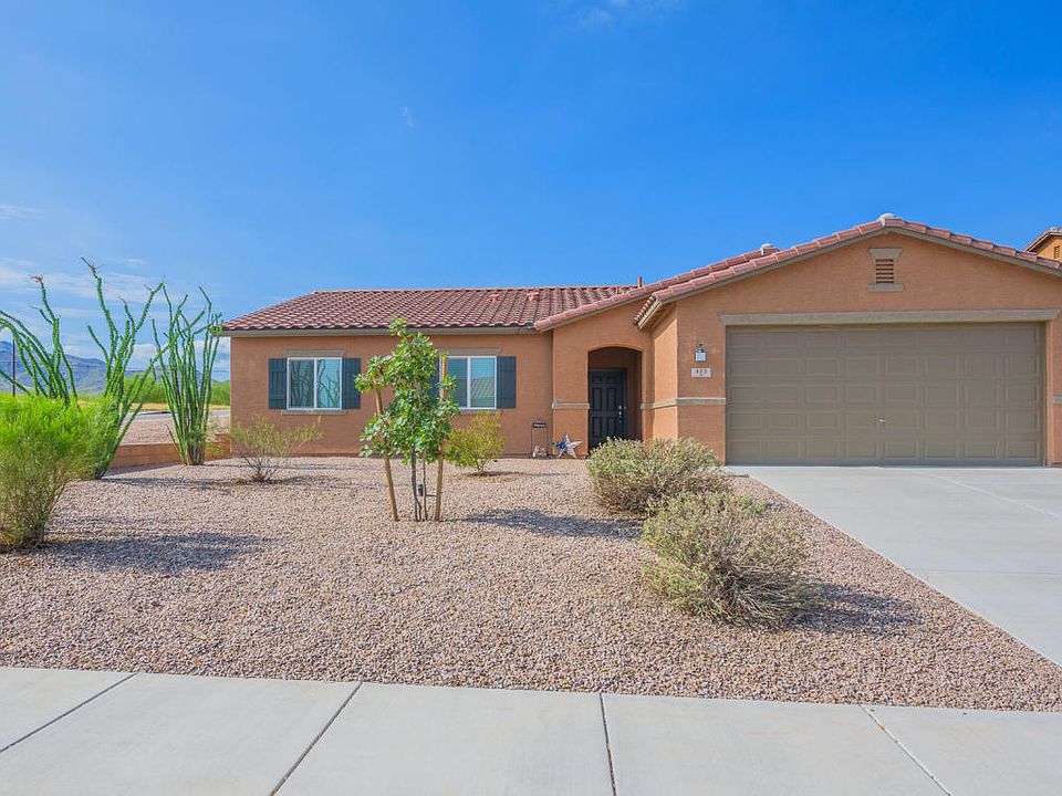 Impeccable 1,637 sq ft home located in the highly desired Vail School District. Built in 2014, this well kept home includes stunning Santa Rita mountain views, 2 car garage, an open and airy layout, 3 bedrooms and a den for extra living space. Cute and cozy kitchen comes complete with stainless steel appliances, granite countertops, kitchen island and plenty of cabinet space. Master suite boasts double sinks in bathroom and large walk-in closet. Laundry room is located off of kitchen and includes built-in shelving. Huge graveled back yard with artificial grass and covered patio to admire those stunning southwestern views.
