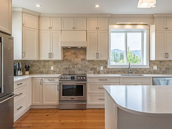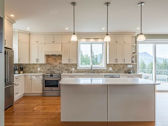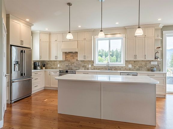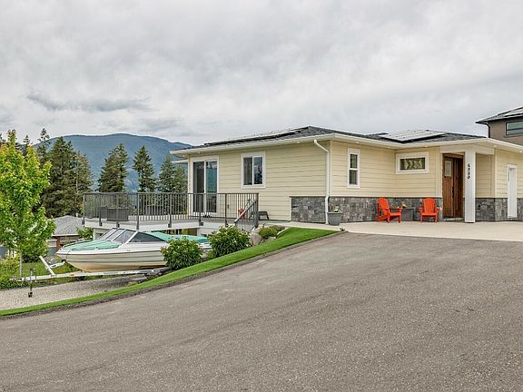 Beautiful custom-built home with fabulous mountain and lake views, located in desirable northeast Salmon Arm. This home was built with green energy in mind, and is Net Zero(No electric bill, no gas bill)! It has sufficient solar power to produce more energy than it uses over the year. The moment you enter, you will feel the quality: from the custom entry door to the tamarack hardwood floors, and expansive windows which provide beautiful natural light. The main floor opens to a spacious deck with rolldown blinds in the covered portion. The open kitchen features quartz countertops, custom soft-close cabinets plus a walk-in pantry, and an oversized island w/ breakfast bar. Also on the main floor are the master bedroom and ensuite spa bathroom with walk-in shower and clawfoot tub; large mudroom/laundry room, and another half bath by the entrance. Downstairs are 2 large bedrooms, a full bath, media room, sewing/office nook, open area for exercise equipment/yoga, and large storage/mechanical room. This ground-floor living area opens onto a finished concrete patio and sizeable lawn area, complete with irrigation system, fruit trees and berry bushes. The detached oversized 3 car garage has a 3rd bay large enough for a full size crew cab truck, plus a shop area. At the back of the building there is a 30A power plug, and room for an RV plus a boat – lots of parking space.