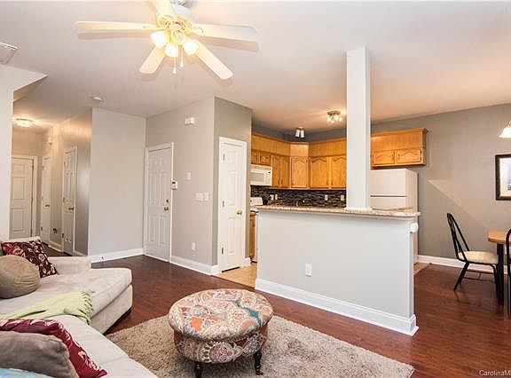 Spacious Town Home nestled in small, quiet Steel Creek community. Very convenient to shopping, restaurants, Premium Outlets and Rivergate Shopping Center. Bright open kitchen and dining area, granite counter-tops and Listello tile back-splash. Relax in the glow of the gas log fireplace on chilly winter nights in your new great room. The spacious Owner's suite features trey ceiling, ceiling fan, sitting area and large walk-in closet. Owner's bath boasts dual vanities and garden tub. Generous secondary bedrooms feature soaring vaulted ceilings. Large storage closets. Upper level Laundry, convenient to bedrooms. Unwind and enjoy the trees from your private back patio. One car garage plus driveway to accommodate extra car. Easy access to I-485, airport and public transit. New roof 2018 and Brand New A/C 2019. Home Warranty Included!