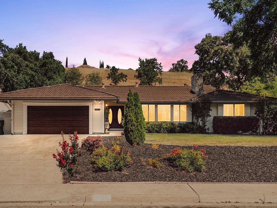 Impeccably maintained home with an entertainer's dream backyard and PAID FOR SOLAR! AMAZING VIEW from the top of the .42 ACRE fenced property perfect for a deck. This home boasts a great open layout with FIVE bedrooms, two bathrooms, formal dining room, breakfast nook, and TWO fireplaces. Large plantation windows with vinyl shutters in the living room allow for an abundance of natural light. Bedroom layout is perfect for every family with three bedrooms/one bath on one side of the house and a master wing on the other side. Inviting office space with fireplace and wet bar makes it the remote worker's dream. Gorgeous custom tile flooring in the kitchen, luxury vinyl plank flooring in the common areas and master bedroom, and new carpeting in four bedrooms. This home also features TWO sets of beautiful French doors opening to the welcoming covered patio area with ceiling fan. Custom stamped concrete leads you to an outdoor gas fire pit which sits next to a pondless waterfall and a large area perfect for an outdoor kitchen. Charming custom garden area with raised beds and drip system. Across from Sunset Whitney Recreation Center with miles of walking and biking trails. Did we mention a 50-year roof? Extras include custom closet systems, whole house fan, large poured concrete side yard