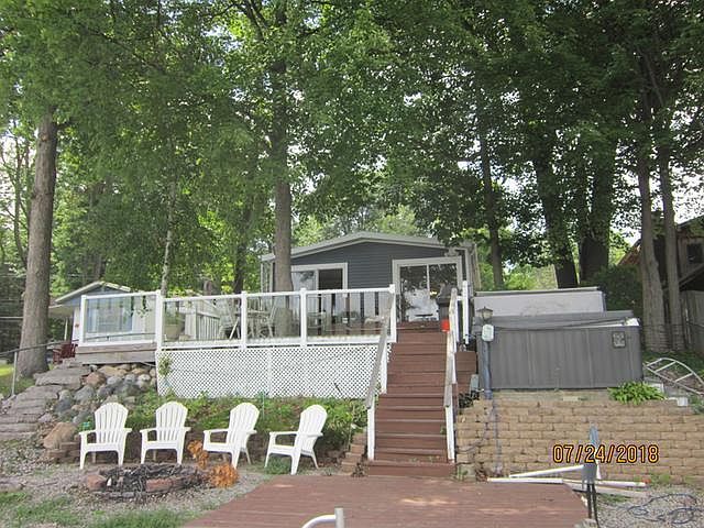 Main Wixom Lake Waterfront. Sandy swimming. Deep Lot. Home has been remodeled inside with new drywall in living area.itchen counter top redone. Open floor plan with fantastic views of lake from large doors and windows. Newer floor coverings in part. Corn burner in familyroom for warm cozy nights. Sliders off familyroom lead to 2 large decks 10x20 each. Master bath has walkin double shower. New high efficient front load washer and dryer. Rubber Roof New in 2008.Outside of home has been reinsulated and new vinyl siding. Hot tub on lakeside deck.Rubber shuffleboard court on side deck. 4 car garage with 3 gargage doors. New service door inside gargage for new owners to install. Long paved driveway. Lots of yard room on roadside with lots of parking for large families. Prime spot on the lake.