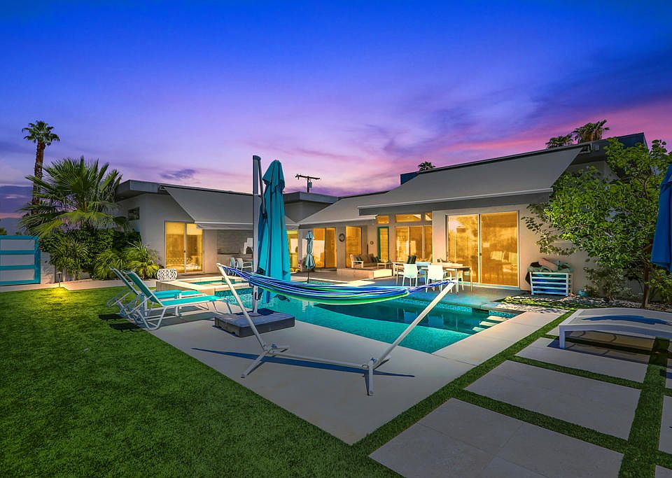 Luxurious living awaits you with this stunning modern residence built in 2019 in Bermuda Dunes Country Club. This exquisite contemporary home is positioned perfectly to take advantage of the mountain views and spacious entertaining areas. Home is thoughtfully upgraded with modern finishes throughout, including a functional eat-in kitchen, stainless steel appliances and sleek Quartz counter tops. The true great room with custom fireplace offers a large open social space with an abundance of light from the grand windows. This oasis has an outdoor courtyard lounge area with fire pit, pool, spa and sit down BBQ/bar area - PLUS high end awnings with professional two-stage misting system!! Primary suite with slider to courtyard pool area boasts his & hers closets, a Texas-sized walk-in shower, separate soaking tub and double vanities. The other bedrooms are at opposite end of home and share a bathroom. The rear yard has pavers, a putting green and soothing water feature. An attached Casita with private entrance and 3/4 bath is conveniently located overlooking the pool area. Additional upgrades include: LED colored landscape lights and LED pool lights and saline system upgrade; artificial turf in front and rear yard; home and fireplace with custom tile; and automated window coverings. Low HOA of only $214 includes internet and cable TV with two boxes with Showtime, Cinemax & HBO with Spectrum plus 24-hour guard gated community. I I D for lower electric.