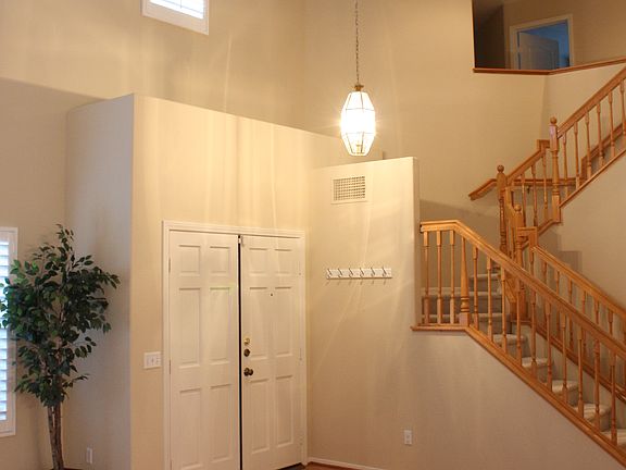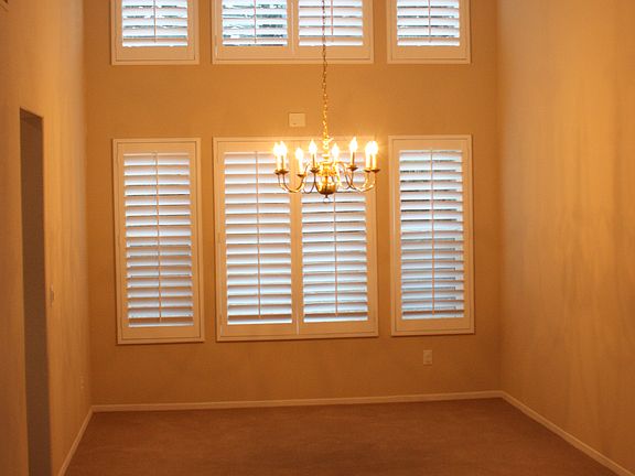 Spacious five bedroom home located in quiet, well maintained culdesav. Plantation shutters on every window. Four bedrooms upstairs and one downstairs. Ceiling fan in every room. Master bedroom is large enough for two queen beds and seating area, and master bath has two spacious walk-in closets and separate soaking tub and shower. Large swamp cooler keeps electric costs down in summer and cools all rooms. Front yard has desert landscaping and iron gates leading to backyard on both sides of house. Backyard is kid friendly with wood chips/mulch, decorative cement, and separate dog run area that leads to garage. Updated light fixtures throughout. Kitchen has updated lighting, granite countertops, tons of cabinet space, large stainless steel farmhouse sink, and built in eat-in area.