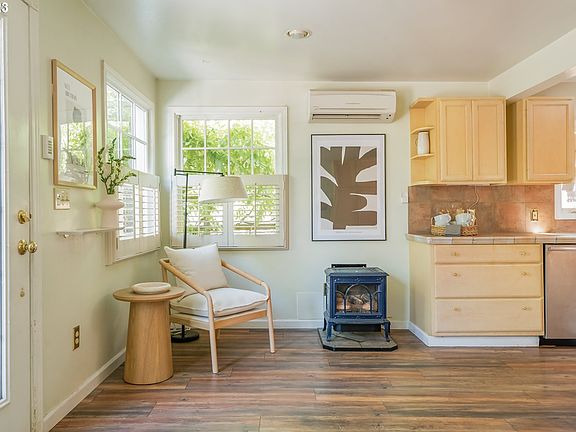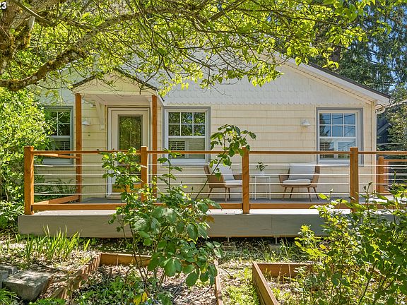 Lovely Multnomah Village cottage sits on a beautiful oversized lot! This cozy home is an entertainer's dream. New deck leads into a spacious kitchen that will inspire you to be a home chef! With stainless steel appliances, built-in oven, cooktop, counter seating, wine refrigerator, built-in dishwasher and microwave. Enjoy the eating nook, next to a gas wood stove, or dine on the deck overlooking the garden. Two bedrooms offer plenty of closet organizers and the 2nd bedroom has a built-in Murphy bed, great for a home office or guest room. Bathroom includes a pedestal sink, walk-in shower, and tub. The living room and dining room combo opens up into a backyard oasis! French doors and a gas fireplace makes this space enjoyable through every season. In this stunning yard, relax under the gazebo next to a soothing stream and pond. Well established foliage and trees throughout the property. Garage is set up as a bonus flex space with 353 additional Sq Ft. Keep as a flex space or use as a garage! Home feels very private, and just minutes away from downtown Multnomah Village. [Home Energy Score = 8. HES Report at https://rpt.greenbuildingregistry.com/hes/OR10215177]