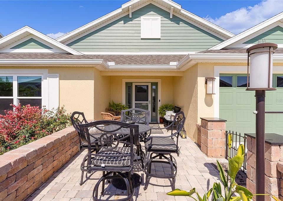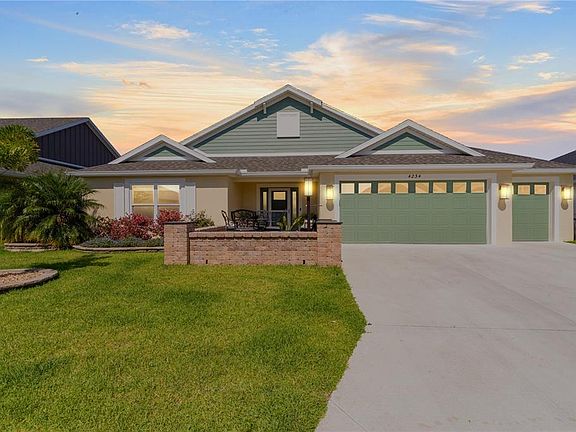 This Isabella Veranda (also known as the Songbird / Zinnia in the Designer Series) comes fully fenced with a privacy wall is located in the Village of Richmond, close to recreation, golf, and Brownwood Paddock Square. Less than 5 minutes by Golf Cart to Brownwood Town Square! Relax on the custom paver patio with iron entry gate to socialize with neighbors and enjoy the sunrise! Inside the home, quartz counters are featured in both the kitchen and baths, along with a basket-weave tile backsplash. The layout includes two bedroom suites, each with a private bathroom and walk-in closet. The primary suite includes dual vanities, a roman shower, and a large walk-in closet. Crown molding runs throughout the entire home, which has been professionally painted in neutral colors. Additional updates include upgraded light fixtures and a whole-house water filtration system. Home is only 3 years old! Mechanicals maintained and serviced regularly. The exterior features professional landscaping, a two-car plus golf cart garage, and pool potential on the side yard! This home combines an updated interior with convenient access to recreation, golf, and entertainment. The Richmond Recreation Center is only .3 miles away and offers an adult pool, shuffleboard, and both large and small dog parks. The Clarendon Recreation Center, with a family pool, is just .5 miles away. Within one mile you’ll also find the Lake Okahumpka Recreation Center, Richmond Pitch and Putt, and the new Harry and the Natives Restaurant. Brownwood Paddock Square is one mile away with shopping, restaurants, and nightly entertainment, just over the Brownwood Bridge on SR44. All major conveniences are at your finger tips! Access to I-75 and FL Turnpike are also only a few minutes away! Start living your retirement dream with everything you need just around the corner!