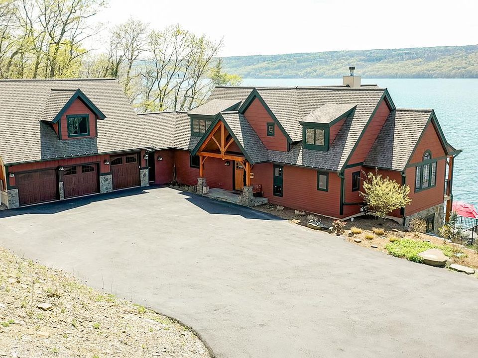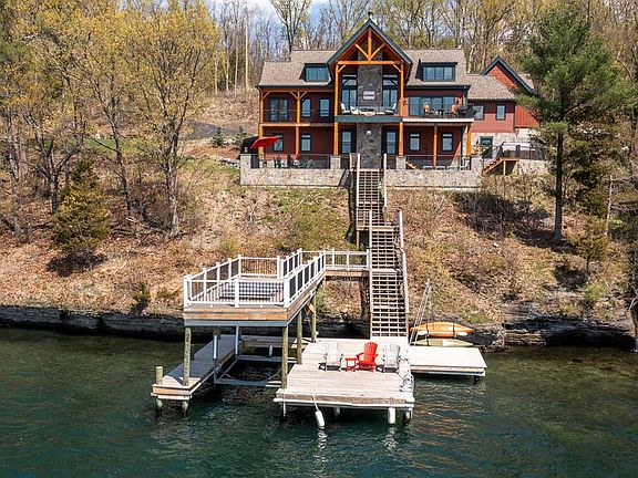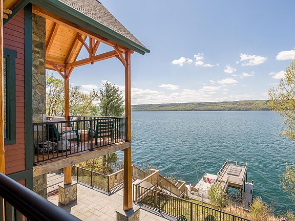 Seneca Lake home is ready for a new owner. This year-round home is being sold “turnkey. The floor plan opens to the lake with large lake-facing windows allowing the home panoramic views of Seneca Lake. The Living room showcases an expansive stone wood-burning fireplace and cathedral ceilings. Enjoy relaxing, beautiful sunsets from the many open lake-facing front decks. The Finger Lakes Region is a popular tourist area, and this home is just off the Seneca Lake Wine Trail, where a visit to the local wineries and restaurants is a short drive. This home offers an investment opportunity too.